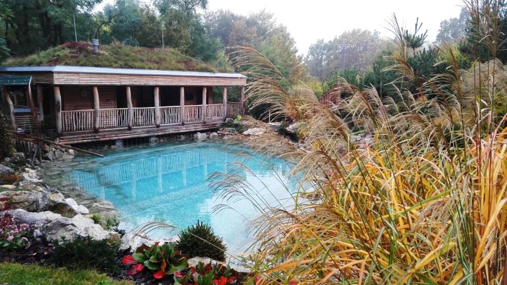Zahrada rodinného sídla s koupacím jezerem, potokem a altánem